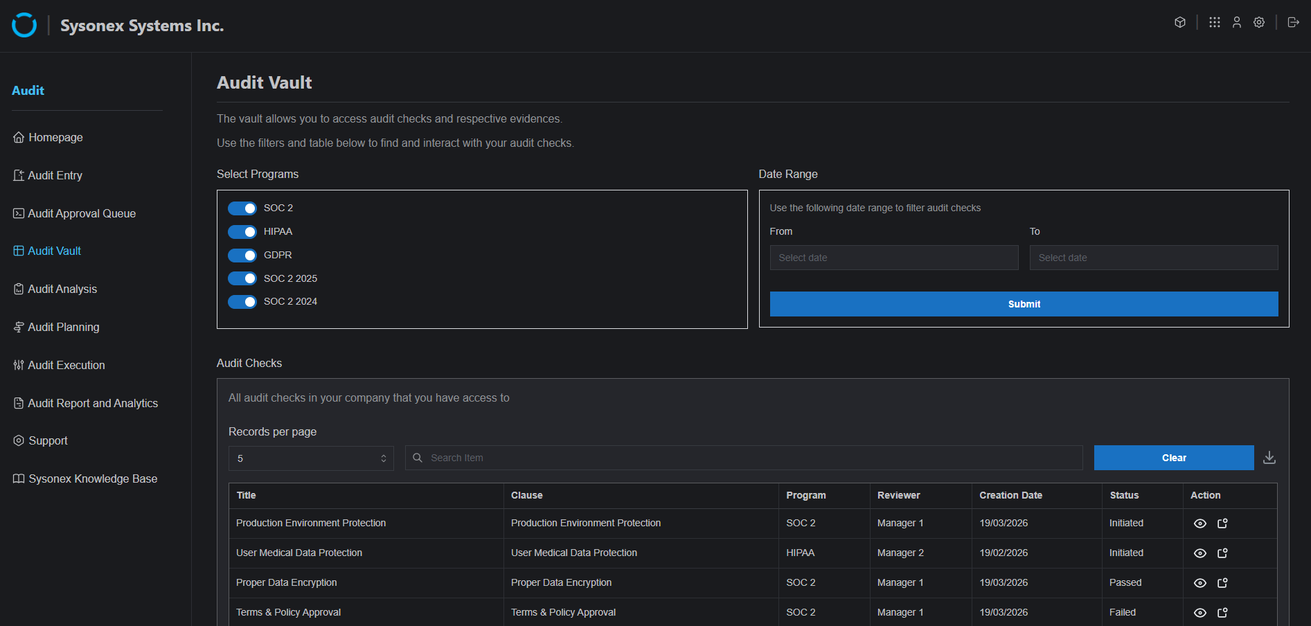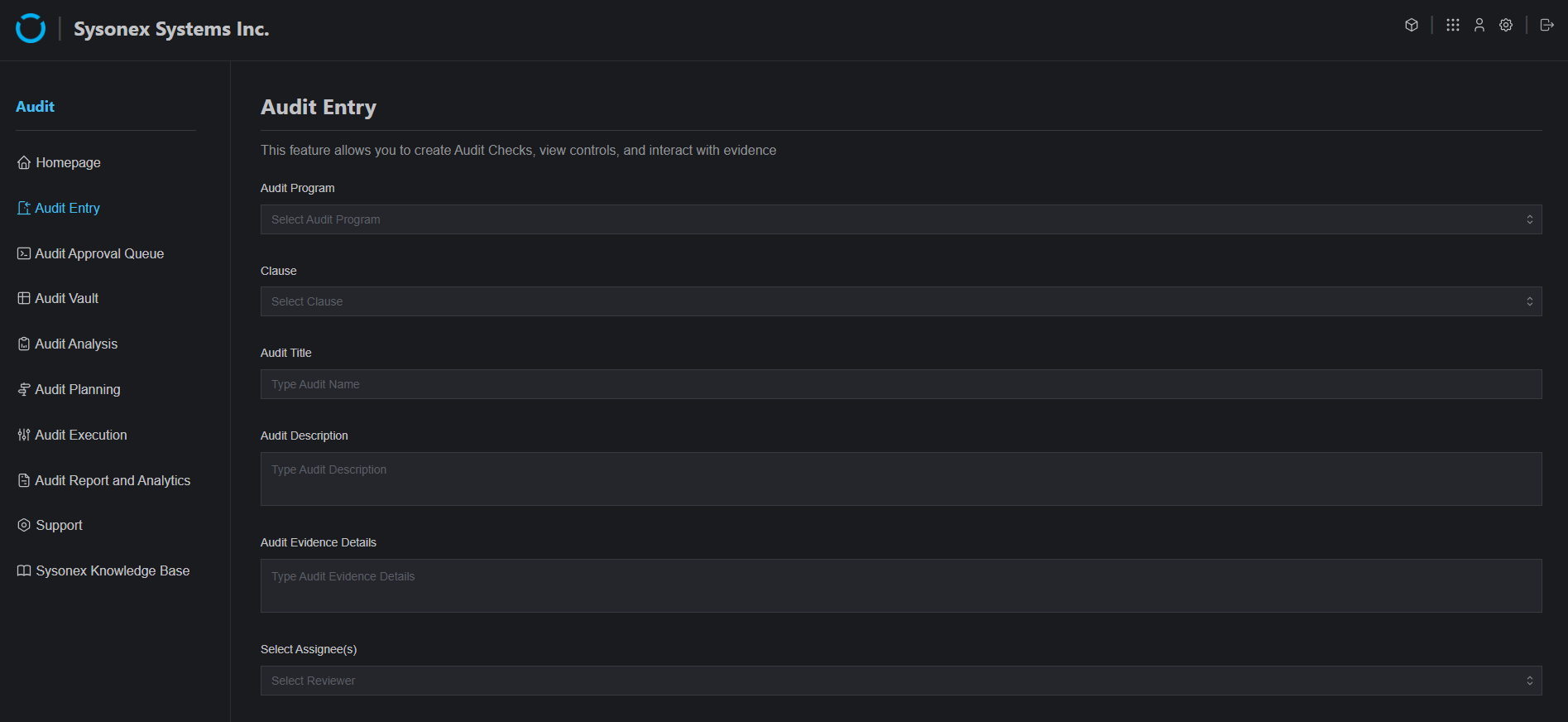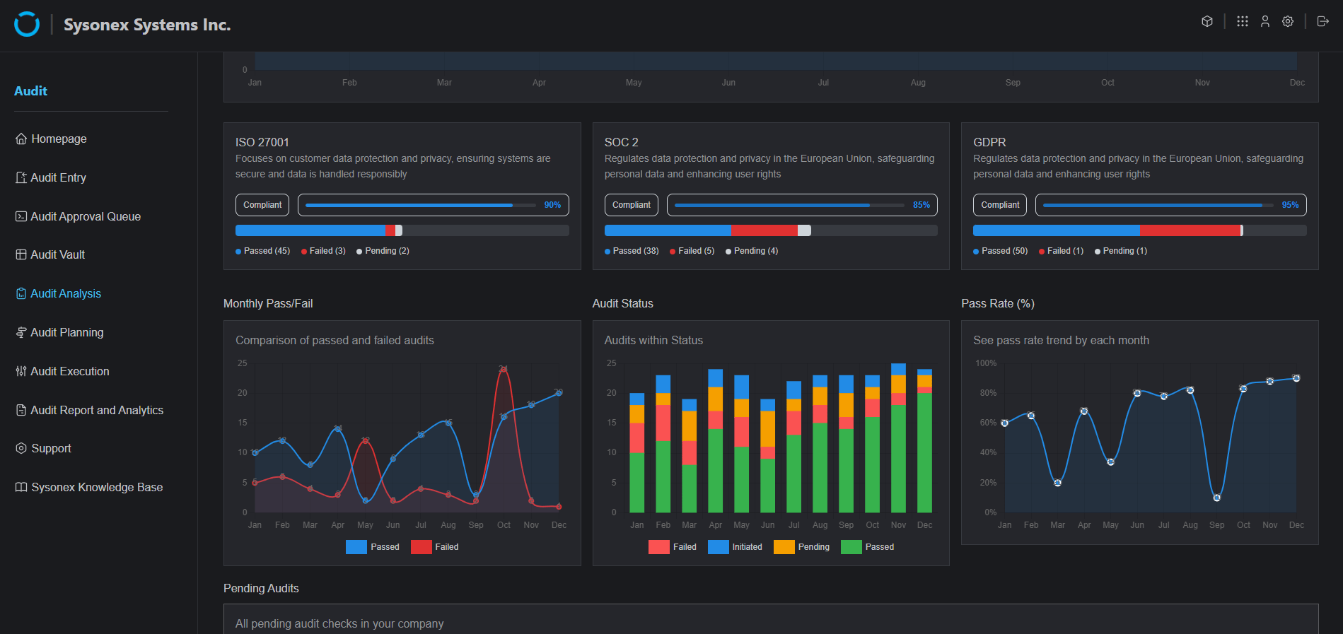SysAudit by Sysonex is a powerful, all-in-one IT audit management platform designed to simplify every stage of your audit process. From creating audit entries and planning with your team to executing checks, managing approvals, and generating detailed reports — SysAudit brings everything together in one clean, easy-to-use platform. With built-in compliance support for frameworks like ISO 27001, SOC 2, HIPAA, and GDPR, your organisation stays audit-ready at all times. Whether you’re a small team or a large enterprise, SysAudit gives you the visibility, control, and confidence to manage audits smarter and faster than ever before.