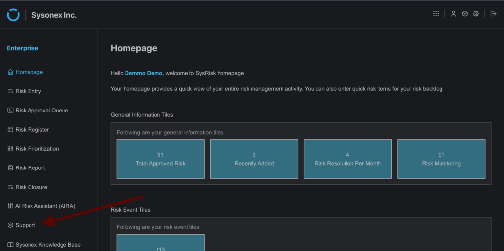 SysRisk offers a builtin support system that allows users to easily submit queries and receive assistance directly from within the software. The Support page is accessible to all user roles, ensuring a seamless connection to SysRisk’s Customer Success team for fast and efficient problem resolution.